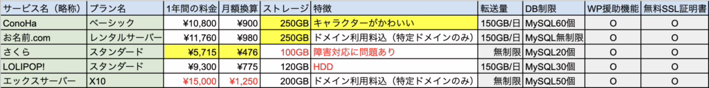 ブログを普通に運用する分には十分な量が確保されているため比較対象から外しています。